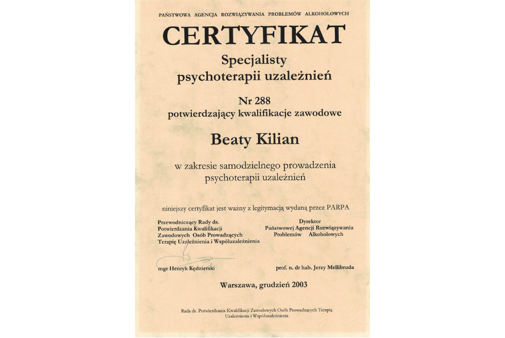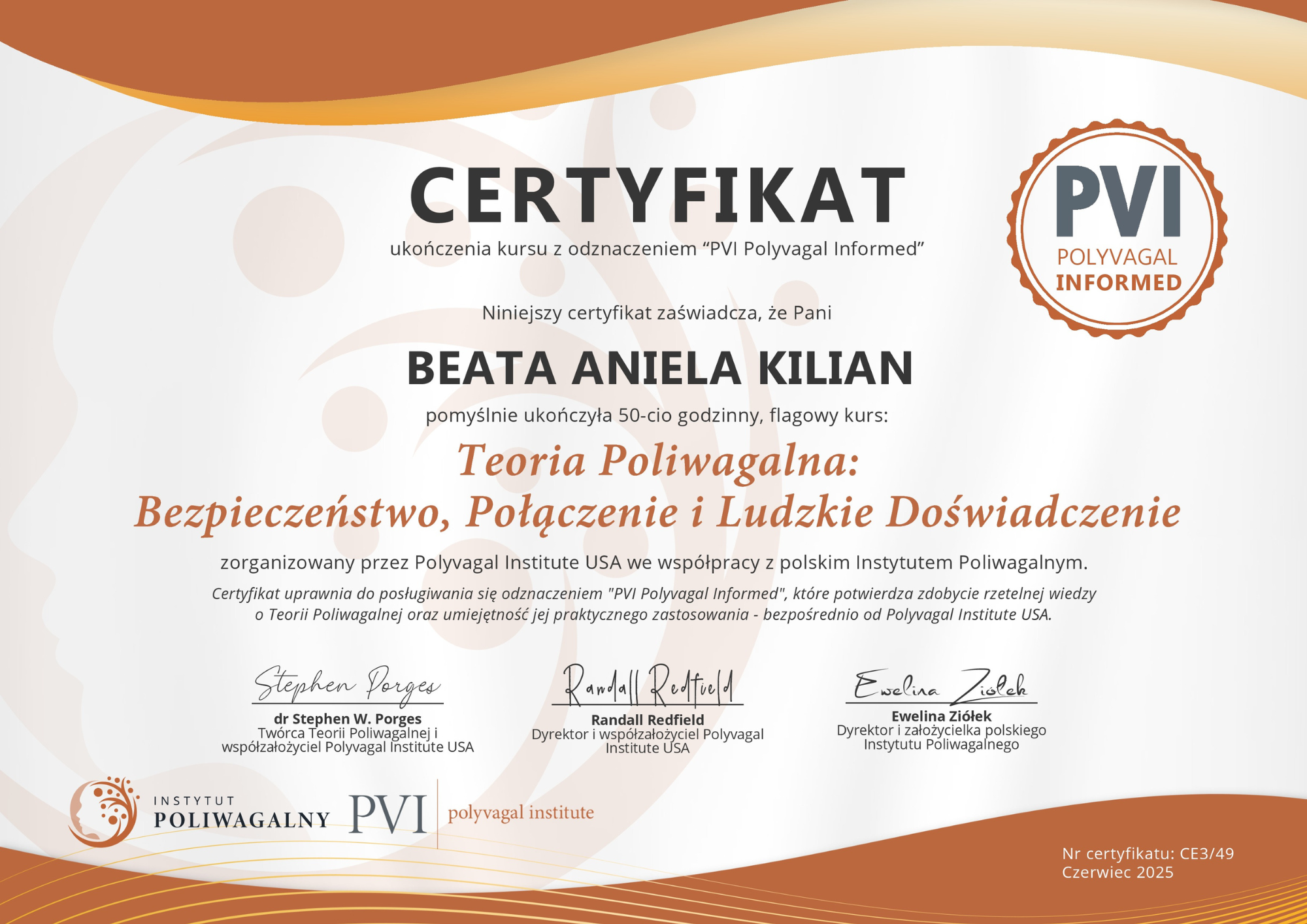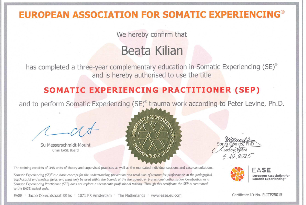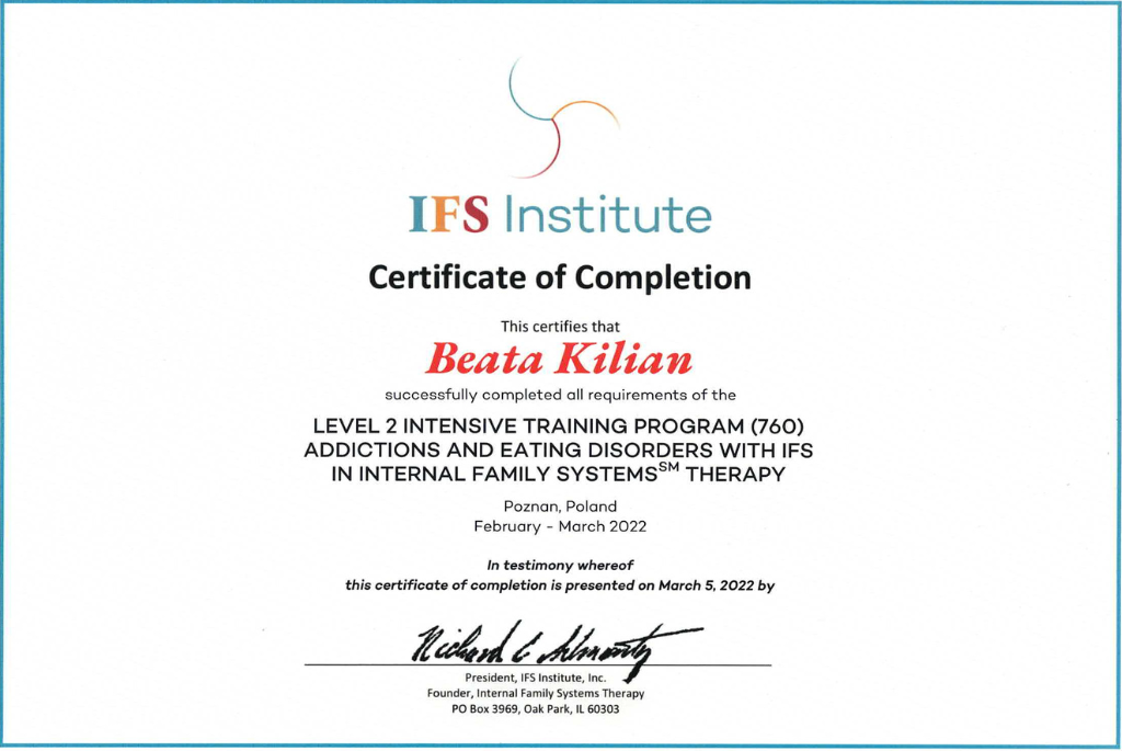 Mam wykształcenie psychologiczne, jestem certyfikowaną Specjalistką Psychoterapii Uzależnień, Współuzależnienia/ DDA, praktykiem Internal Family System (ukończyłam 2 poziomy edukacji w ramach treningu terapii IFS). Skończyłam studia podyplomowe z Psychotraumatologii oraz z Artterapii; 3 letnie szkolenie z terapii psychosomatycznej – Somatic Experiencing® oraz Kurs z Teorii Poliwagalnej z certyfikatem PVI USA.